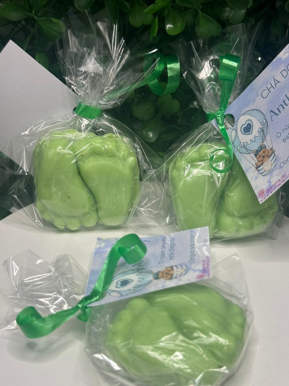 Os sabonetes vão embalados nos saquinhos transparentes com fitílho e tag,