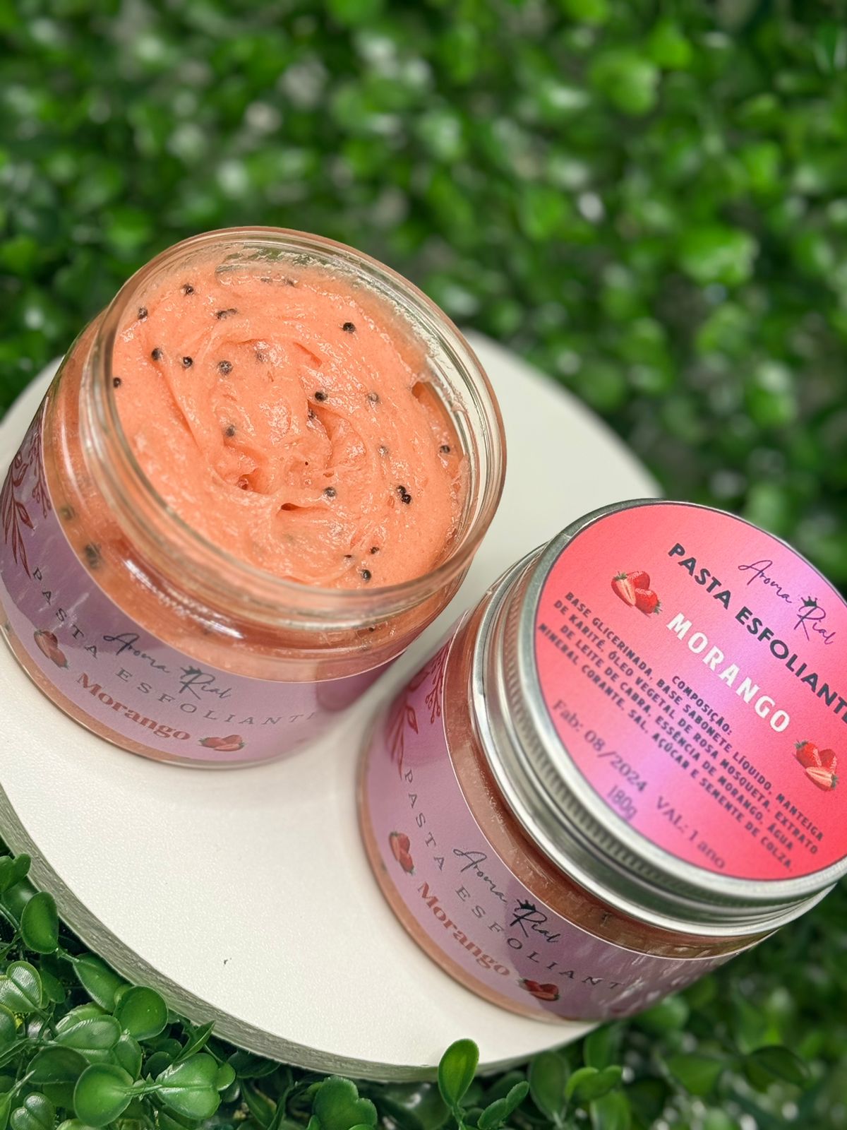 Nossa Pasta Esfoliante Morango promove uma esfoliação eficaz e gentil, combinando o poder nutritivo da manteiga vegetal de manga, dos óleos vegetais de gérmen de trigo e coco de babaçu, e do extrato de leite de cabra, para uma pele mais macia, luminosa e hidratada desde a primeira aplicação.